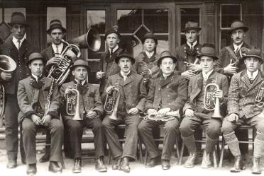 | mit Tellerkappen und Silberkordeln wurden die Uniformen der Musikkapelle aufgepeppt | |||
